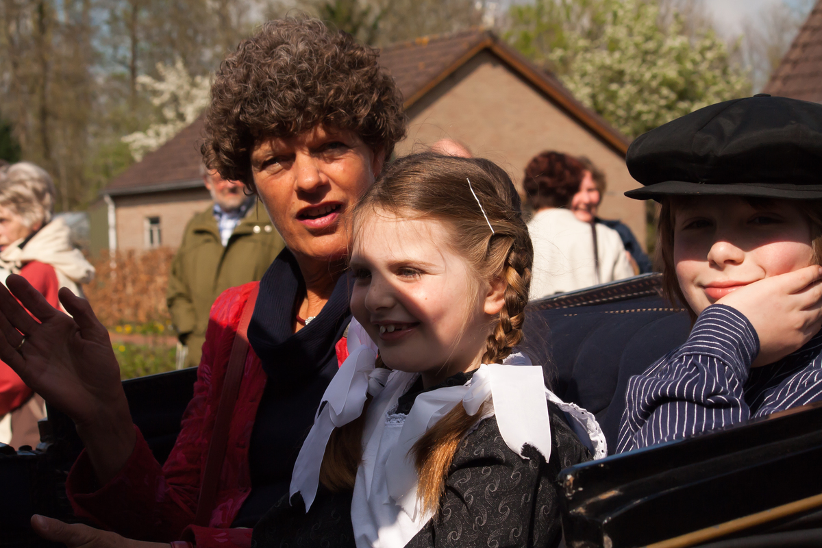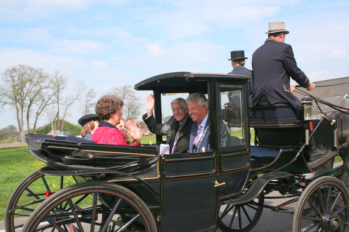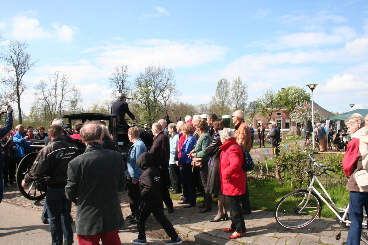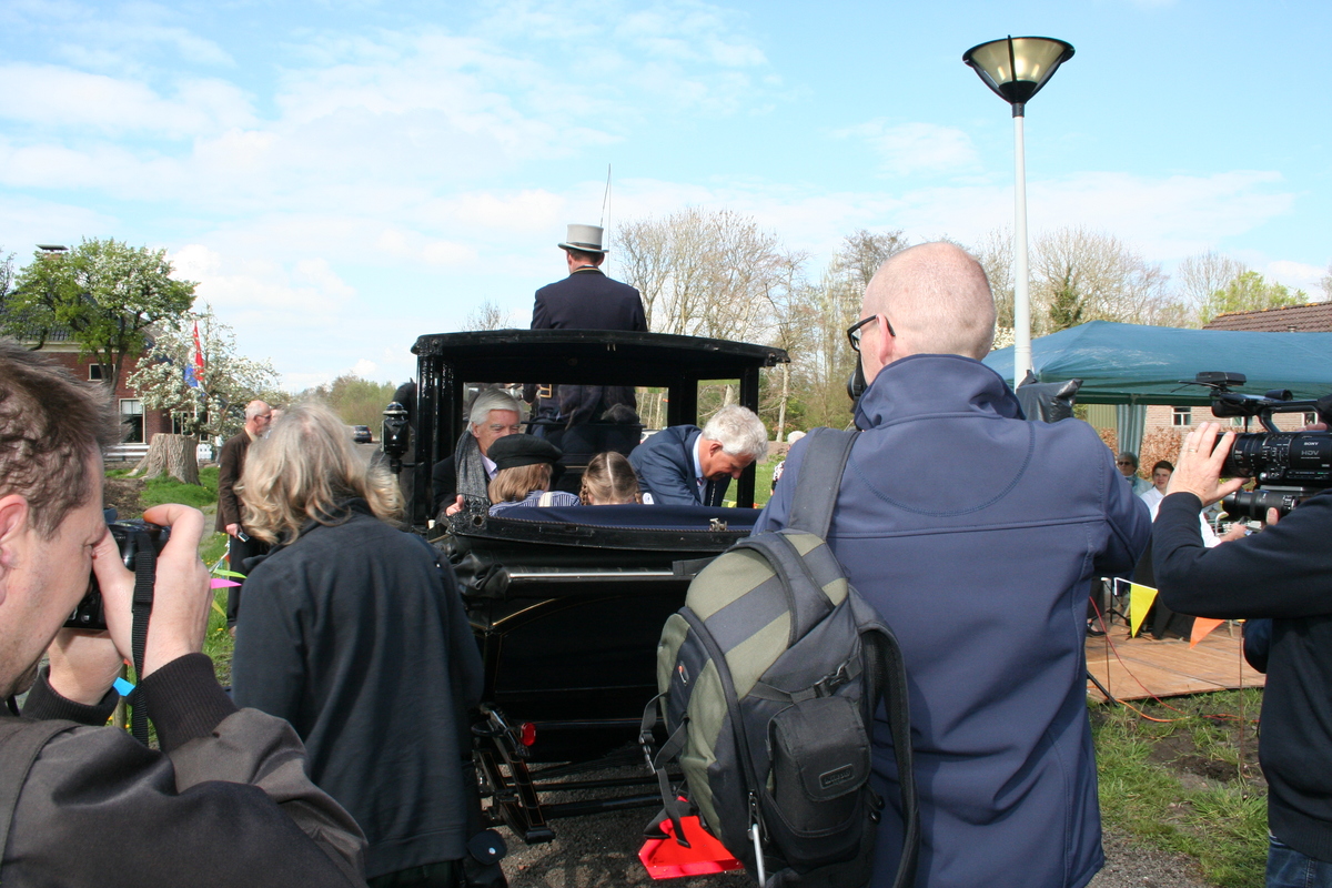 Daar kwam de landauer aanrijden met een gezelschap van personen, die allen een rol zouden spelen in de opening van de CazemierBoerderij. Een leuke Minicooper met de dorpsomroeper, die de opening luidkeels aankondigde, reed voorop.