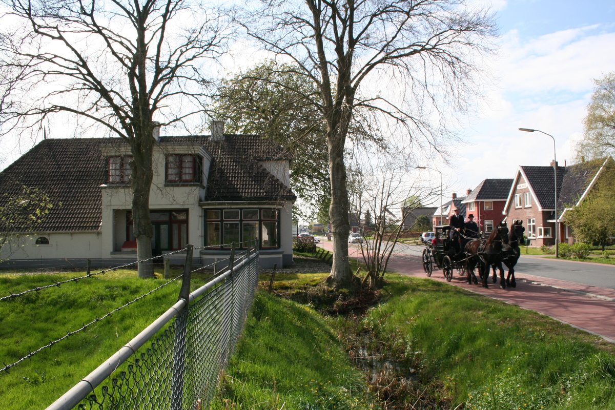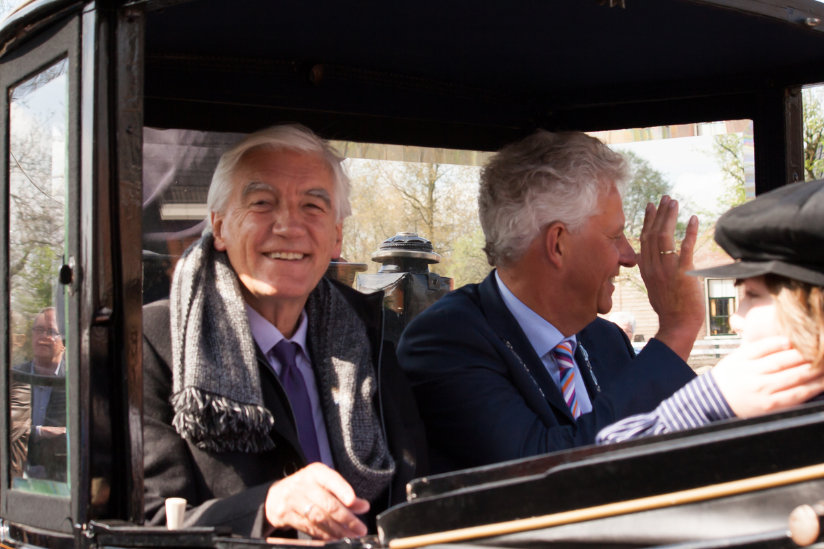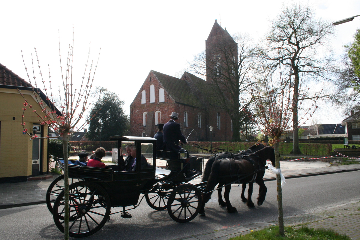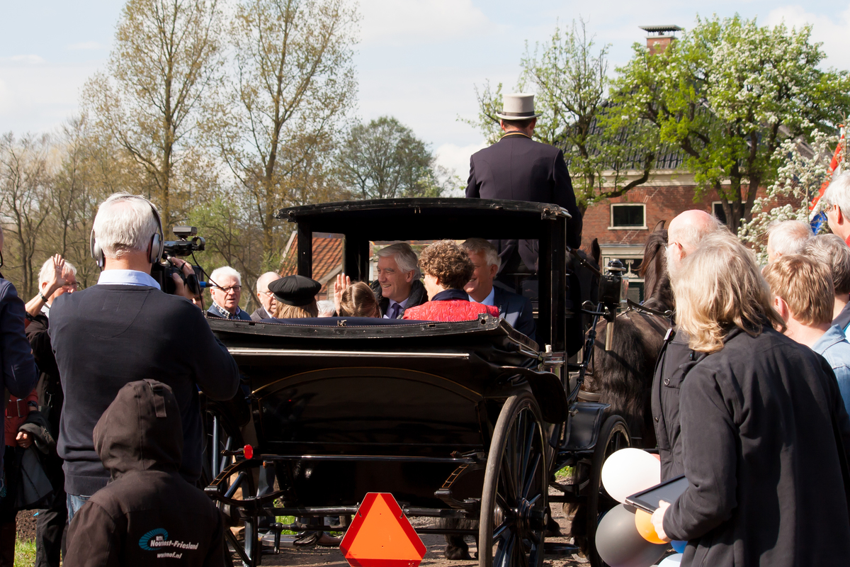 Daar kwam de landauer aanrijden met een gezelschap van personen, die allen een rol zouden spelen in de opening van de CazemierBoerderij. Een leuke Minicooper met de dorpsomroeper, die de opening luidkeels aankondigde, reed voorop.