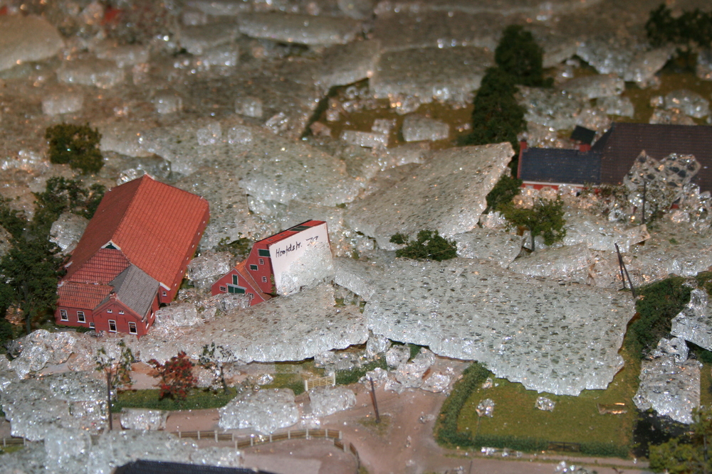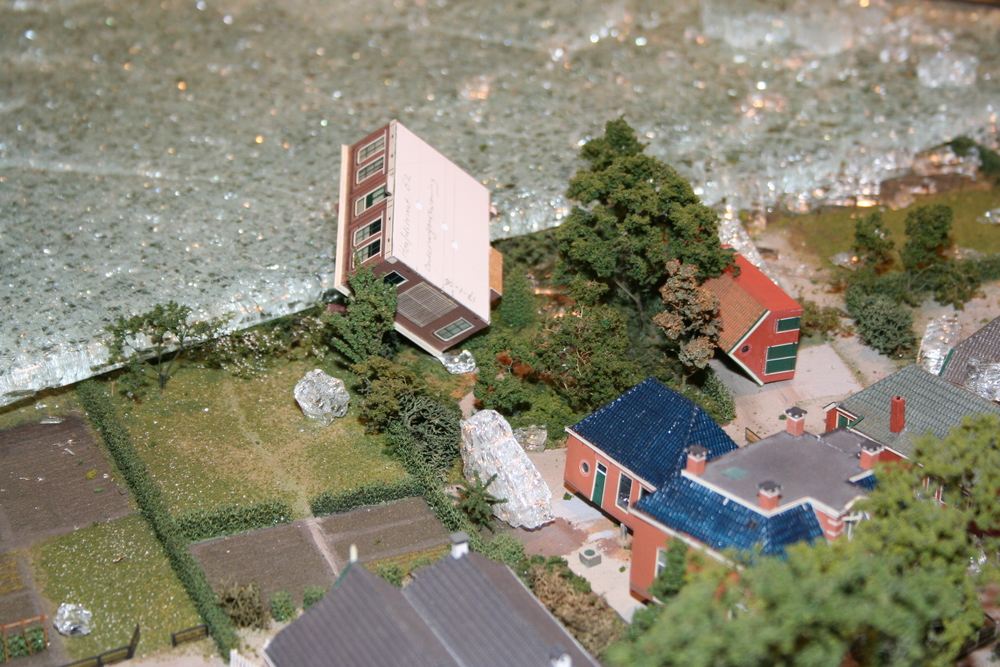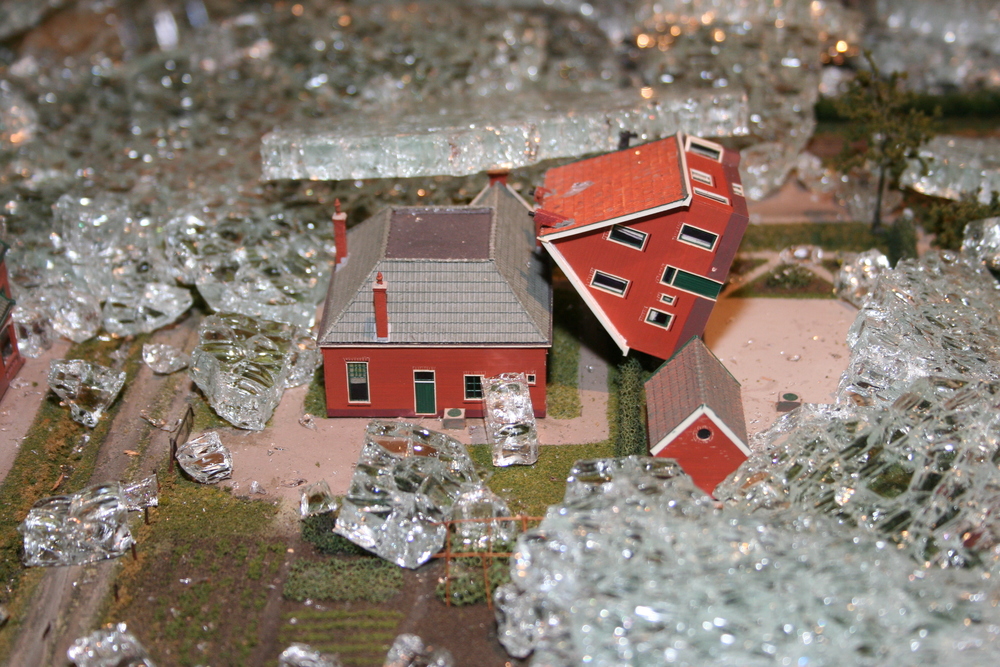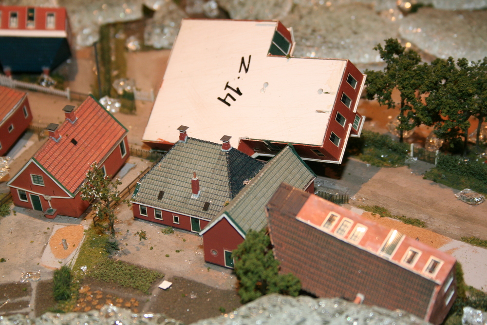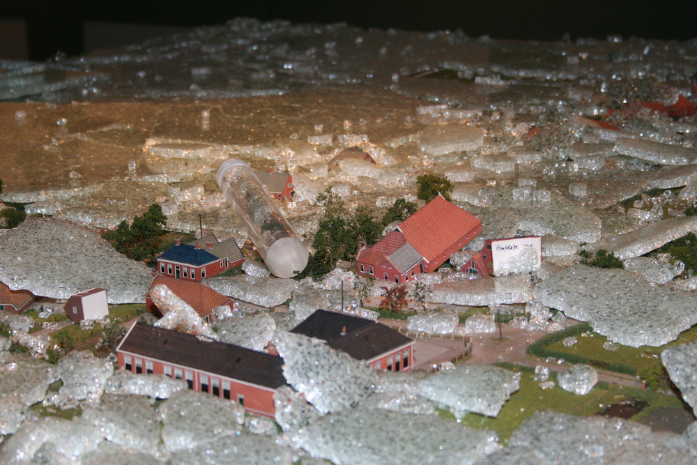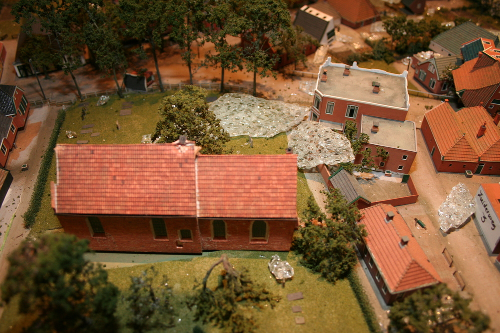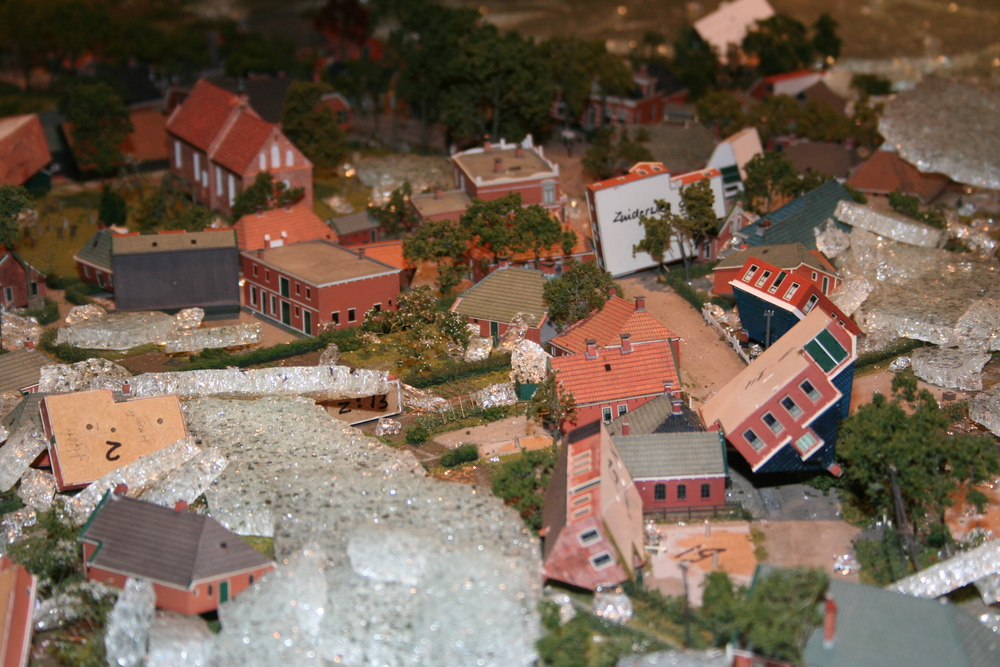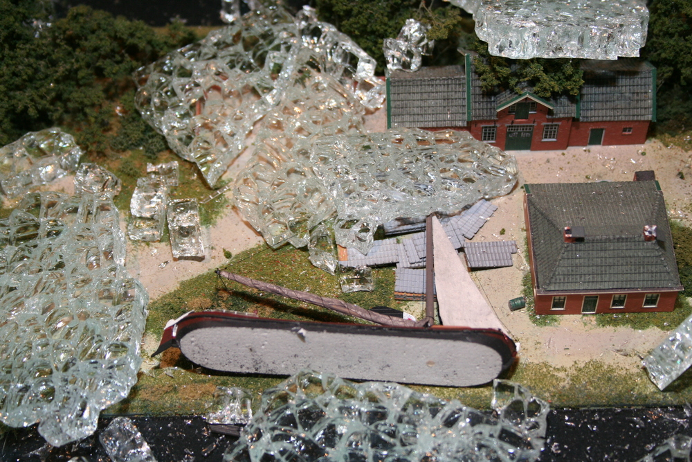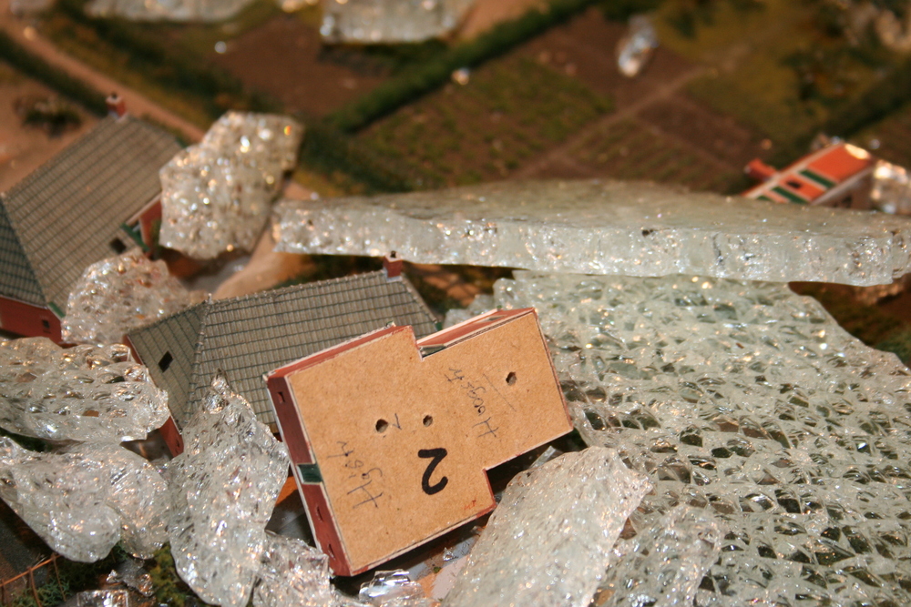 De mensen die in het voorhuis vergaderden hoorden plotseling een harde knal en een aanhoudend brekend geluid. Toen zij in de ruimte kwamen waar de maquette staat opgesteld, werd duidelijk wat er aan de hand was. Ze zagen één grote ravage. Grote delen van de maquette waren bedekt met een laag gebroken glas, die voor een groot deel de panden en de straten bedekten. Veel panden en het groen zijn daardoor beschadigd. Een triest gezicht.