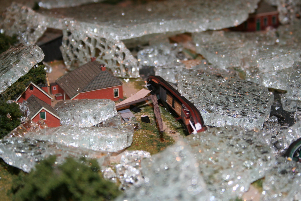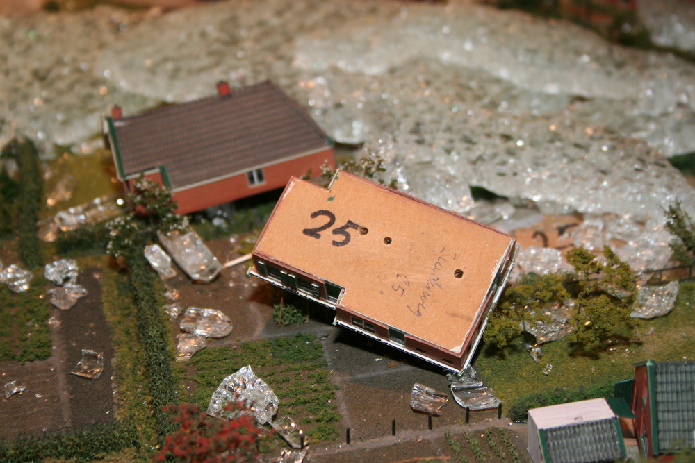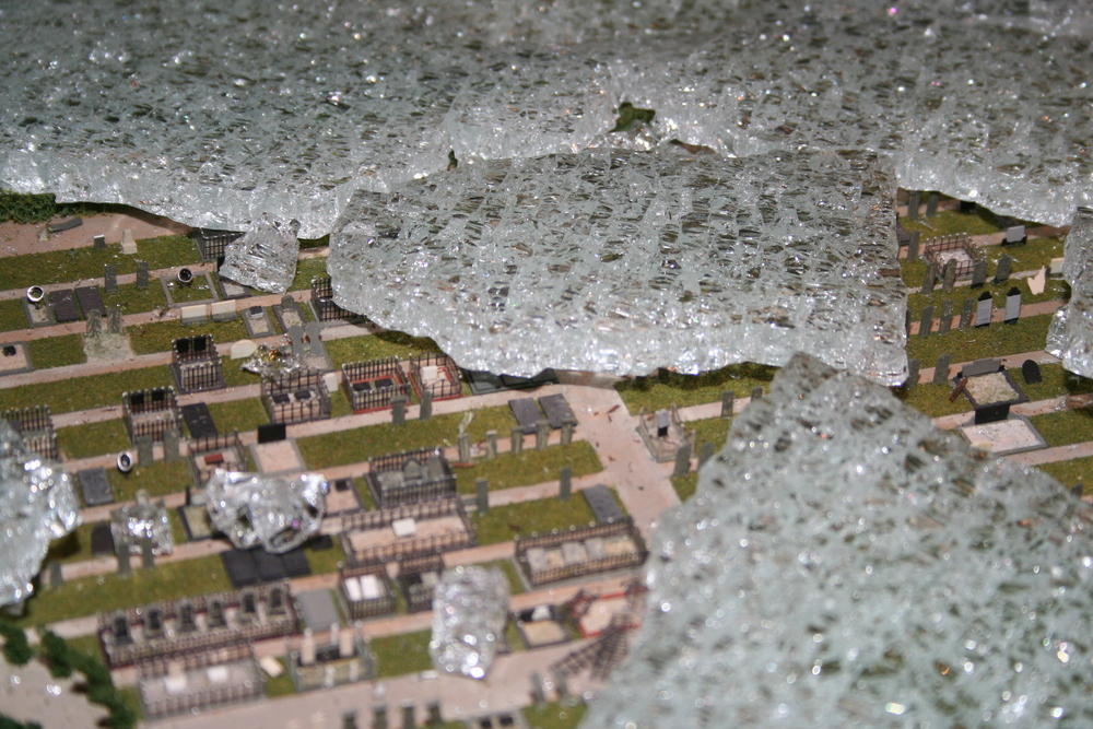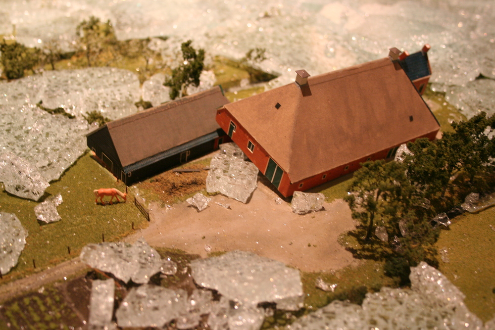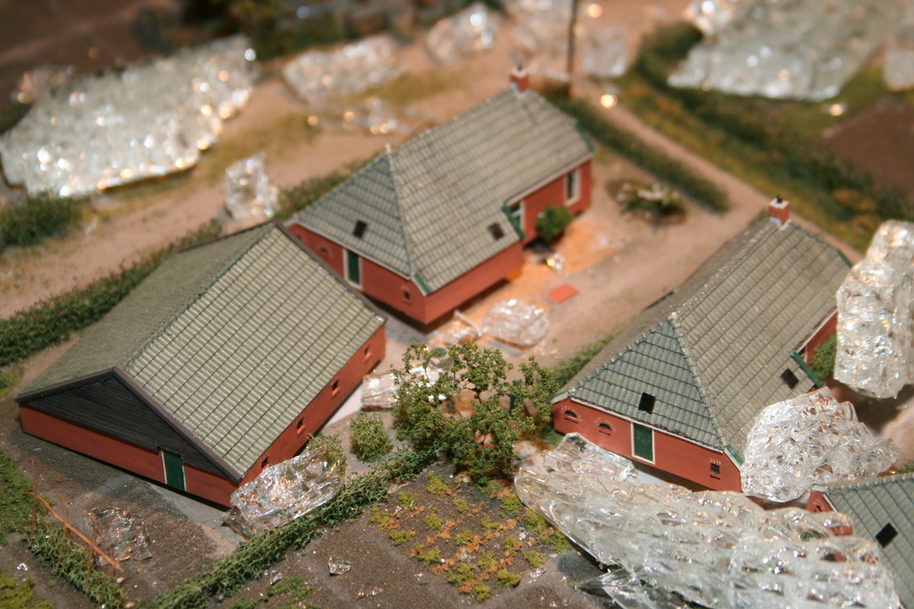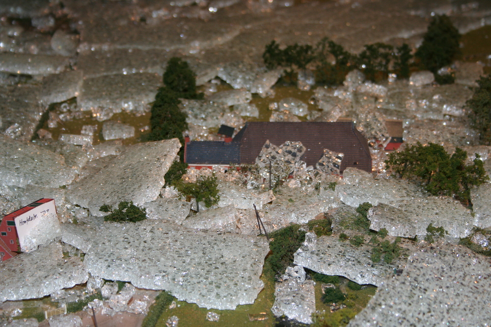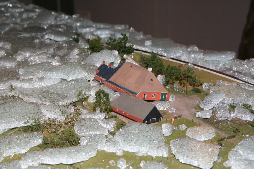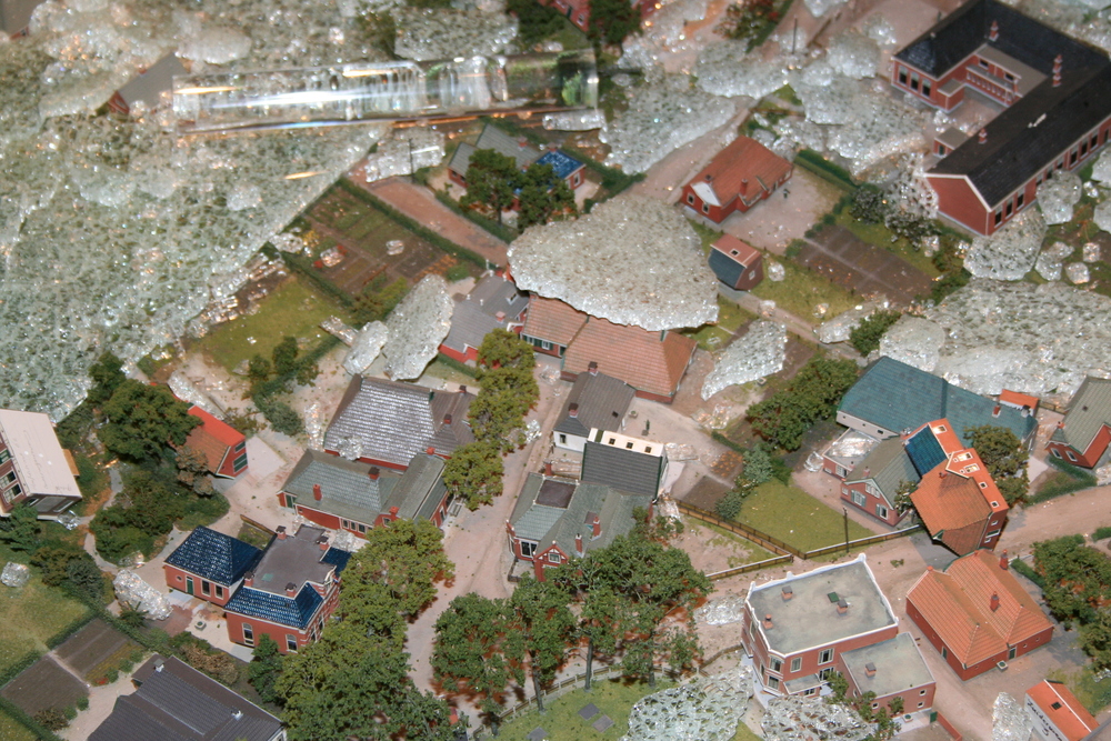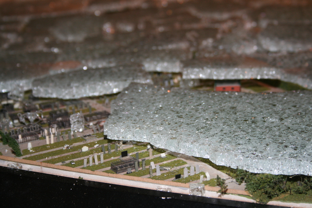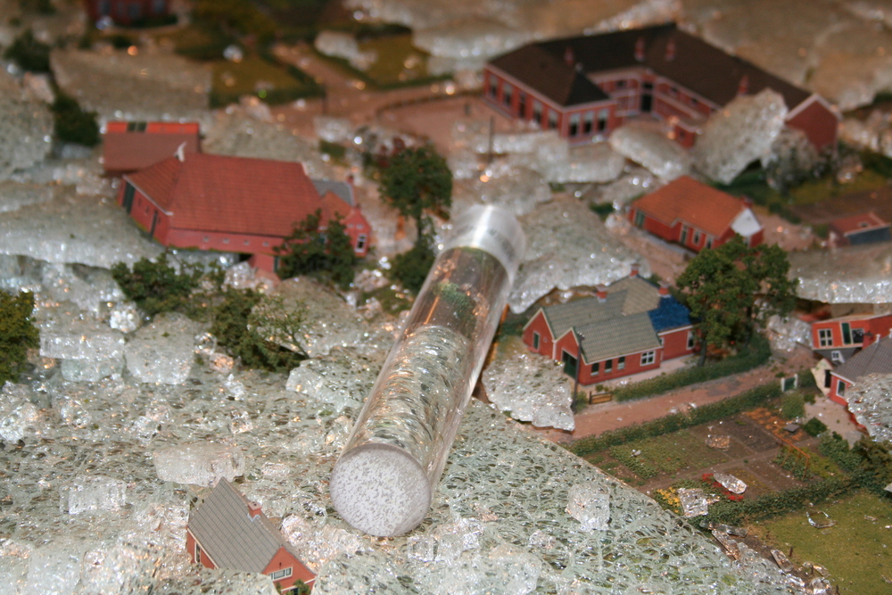 De mensen die in het voorhuis vergaderden hoorden plotseling een harde knal en een aanhoudend brekend geluid. Toen zij in de ruimte kwamen waar de maquette staat opgesteld, werd duidelijk wat er aan de hand was. Ze zagen één grote ravage. Grote delen van de maquette waren bedekt met een laag gebroken glas, die voor een groot deel de panden en de straten bedekten. Veel panden en het groen zijn daardoor beschadigd. Een triest gezicht.