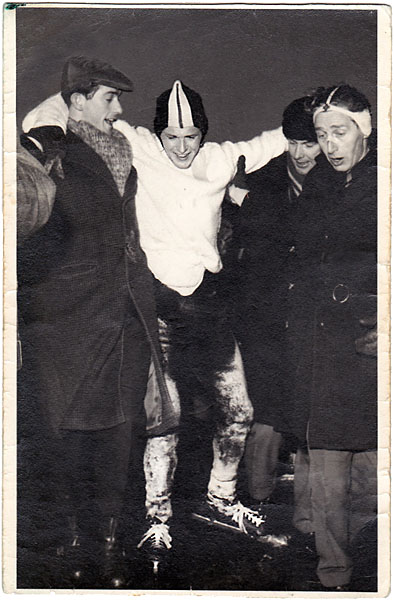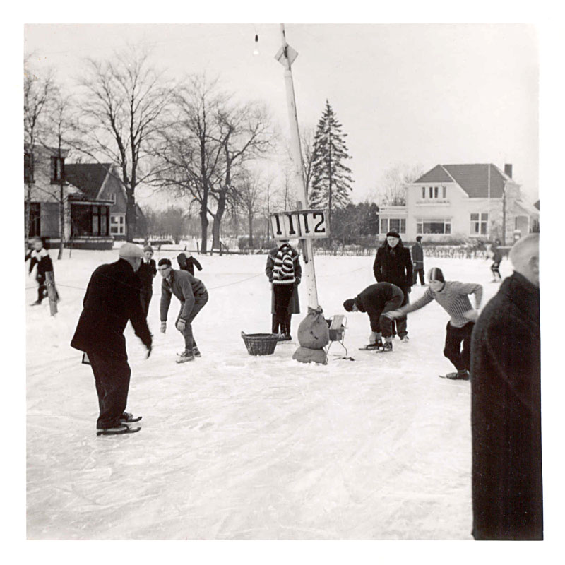 Aan de ijsbaan in de jaren vijftig van de vorige eeuw heb ik heel goede herinneringen. Altijd met je jeugdvrienden op de iesboan scheuveln. Korte Baan wedstrijden kijken met Oom Jan (Venema de makelaar) aan de microfoon als omroeper. Aan het eind van de baan iemand van het bestuur met touw om de rondrijdende schaatsers tegen te houden als de kortebaanrenners na de rit moesten uitlopen. Met een lange stok aan de laatste lantaarnpaal werd aangegeven of links of rechts had gewonnen. Soms was het zo mistig dat je dat niet kon zien. De toegang tot de baan vanuit de Holm, waar wij woonden, ging voor ons nooit door de officiële ingang, maar tussen Atze Meek en Pompstra door over het prikkeldraad.